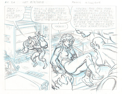 Rough pencil layouts for the opening sequence to the All-New Megaton Man #4 (publication TBD). Megaton Man returns the trailer he used to move back into his old Megatropolis apartment, in which he found new roommate and quasi-sidekick Connie Carlyle subletting. The pair grab a convenient cab ride from Alhambra Rasputin, who has been uploading terrorist videos -- but is he responsible for the attacks that brought the Man of Molecules back to New York, or is he just some homegrown nut? And why are the Doom Defiers playing beach volleyball in Bayonne NJ with terror alert levels through the roof?! The answers may lie at the end of Doomsday Drive...